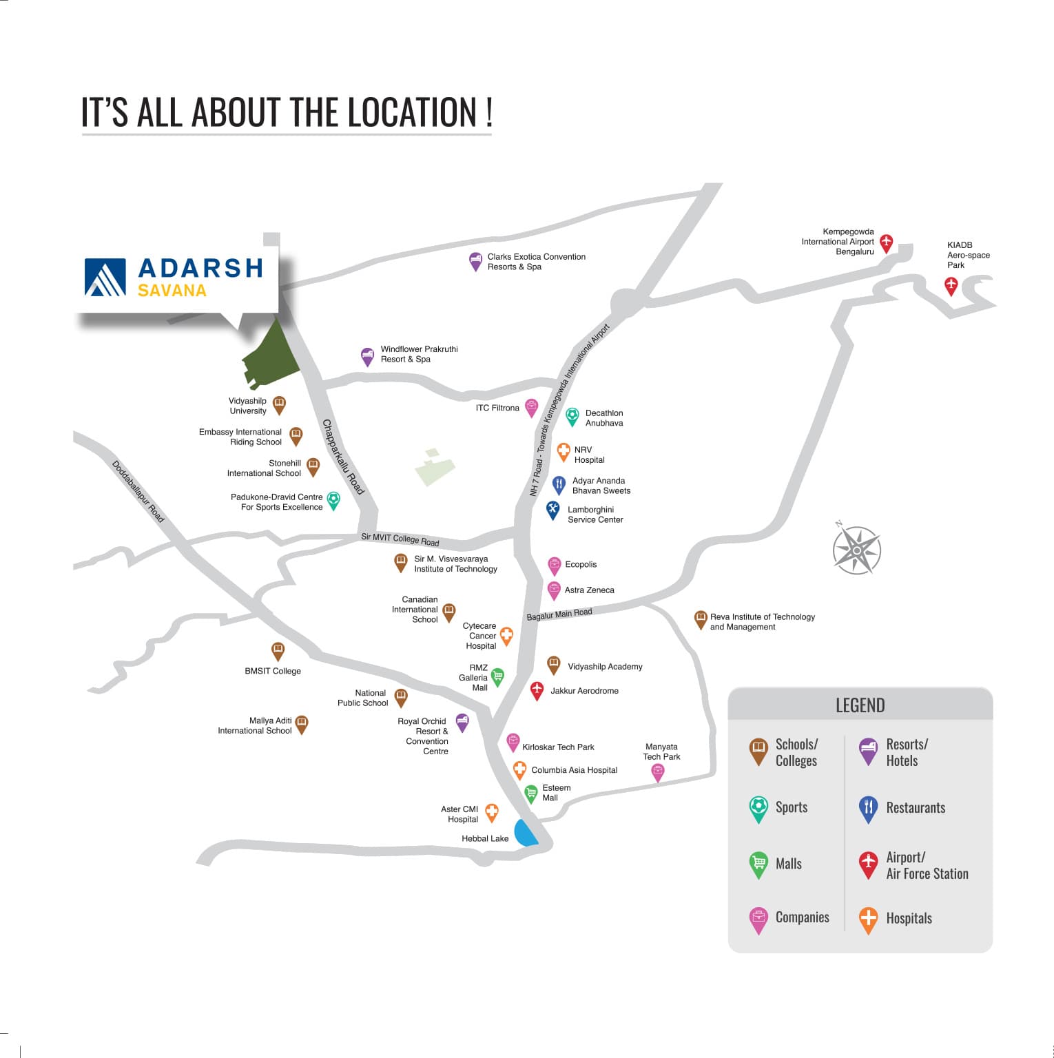 The project is close to Kempegowda International Airport, and well-connected to popular commercial & entertainment hubs, healthcare facilities and top educational institutes. What’s more, the project is just 5 minutes away from Stonehill International School and Padukone-Dravid Centre for Sports Excellence. It’s time to invest in an exponentially developing locale of North Bengaluru. It’s time to own your premium piece of land at Adarsh Savana.